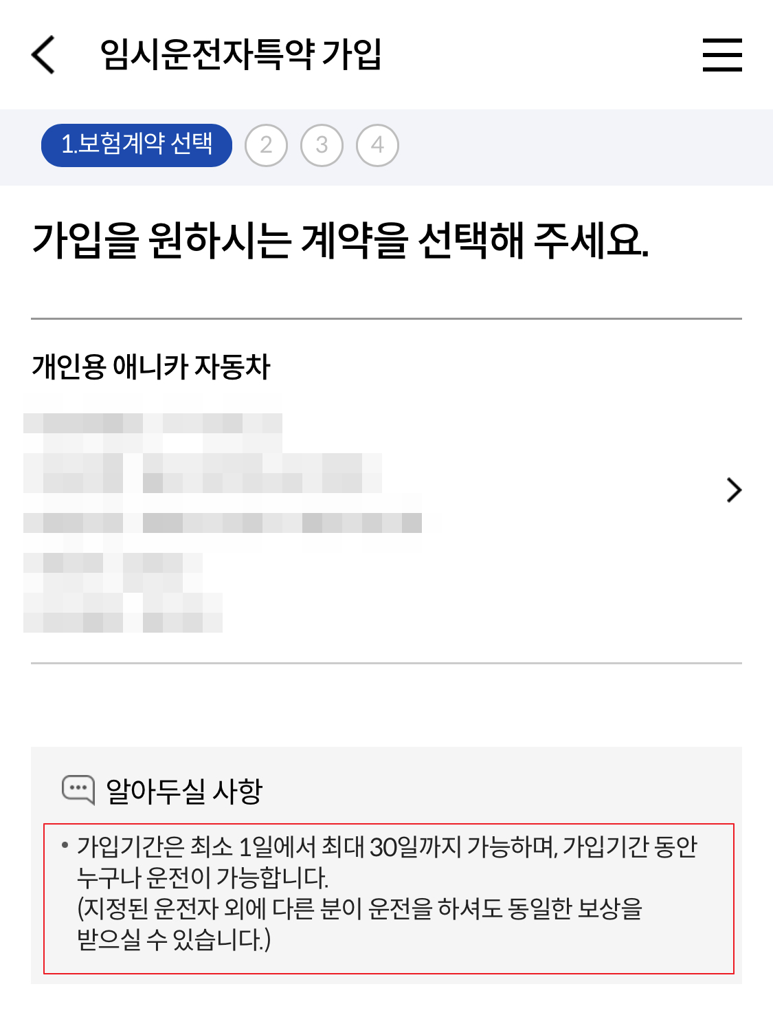 “임시대리운전특약(특정기간 대리운전 범위확대)”이라는 문구로 가입한 자동차보험을 확인하고 가입계약을 선택한 후 하단을 선택(다음단계) <3> 구독 기간 설정