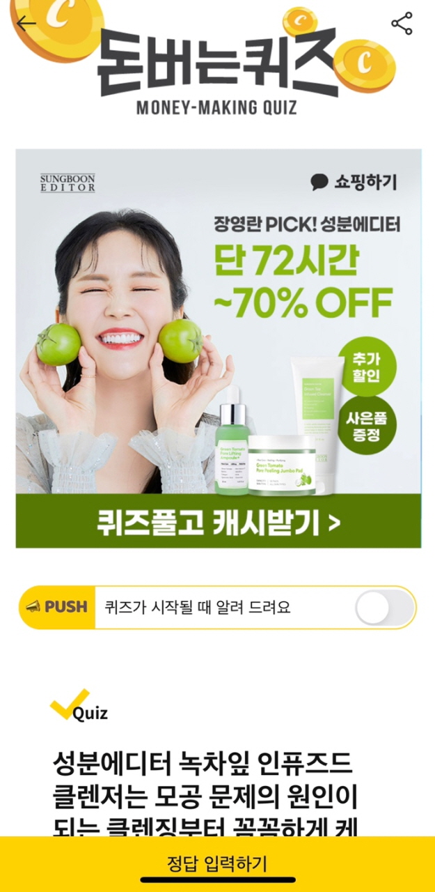 성분 에디터 그린토마토 모공 앰플 캐시워크 돈벌이 퀴즈 11월 17일 11시 30분